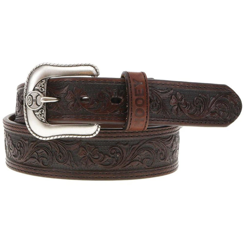 This Hooey classic men’s belt features brown leather, detailed filigree embossed with brown double welt edge and black accents.
