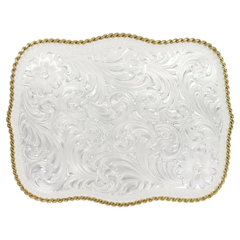 Both understated and strikingly beautiful, there is a reason our authentic fully engraved western style silver belt buckles remain best sellers throughout the years. This large scallop shape belt buckle features bright cut filigree swirls flowing out from two flower accents in opposite corners, all neatly framed with silver stippling. Brightly polished gold twisted rope trim. Standard 1.5 inch belt swivel. Can also be custom ordered with a gold figure.